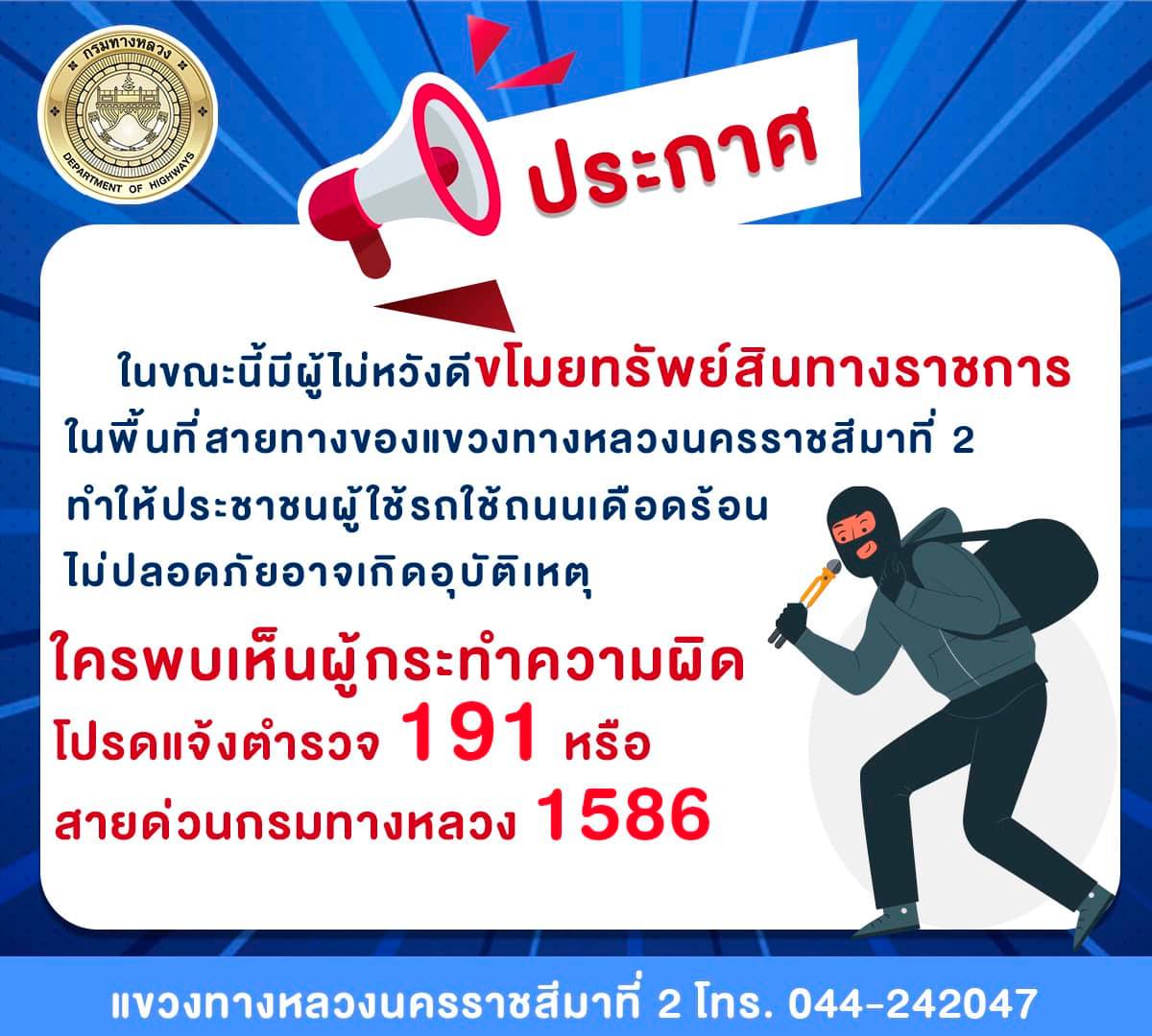 ขอประกาศในขณะนี้มีผู้ไม่หวังดีขโมยทรัพย์สินทางราชการในพื้นที่สายทางของแขวงทางหลวงนครราชสีมาที่ 2