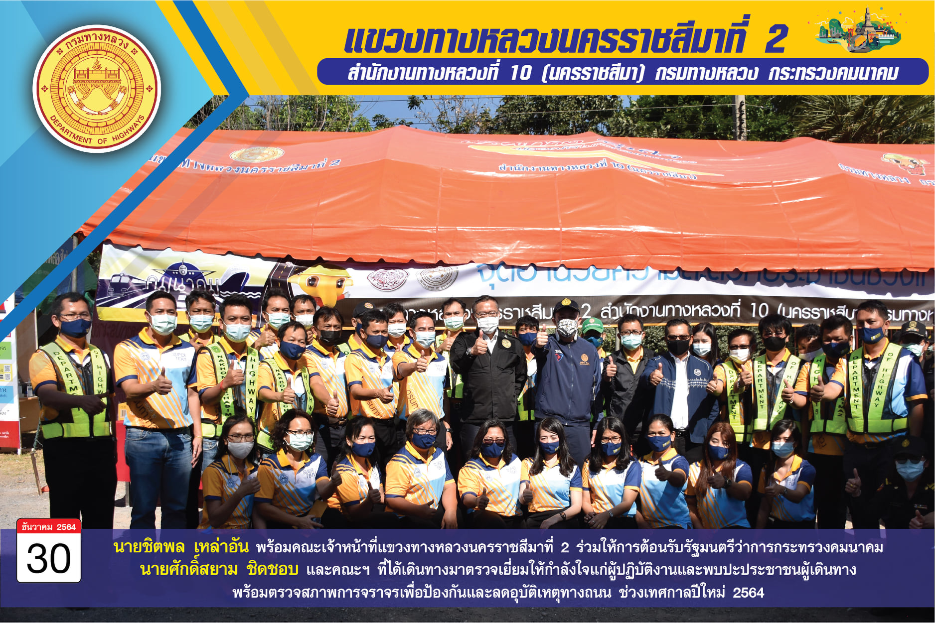 นายชิตพล เหล่าอัน ผู้อำนวยการแขวงทางหลวงนครราชสีมาที่ 2 พร้อมคณะเจ้าหน้าที่แขวงทางหลวงนครราชสีมาที่ 2 ร่วมให้การต้อนรับรัฐมนตรีว่าการกระทรวงคมนาคม นายศักดิ์สยาม ชิดชอบ และคณะฯ ที่ได้เดินทางมาตรวจเยี่ยมให้กำลังใจแก่ผู้ปฏิบัติงานและพบปะประชาชนผู้เดินทาง พร้อมตรวจสภาพการจราจรเพื่อป้องกันและลดอุบัติเหตุทางถนน ช่วงเทศกาลปีใหม่ 2564 ของจังหวัดนครราชสีมา ณ จุดบริการประชาชน เทศบาลตำบลคลองไผ่ ถนนมิตรภาพ อำเภอสีคิ้ว จังหวัดนครราชสีมา